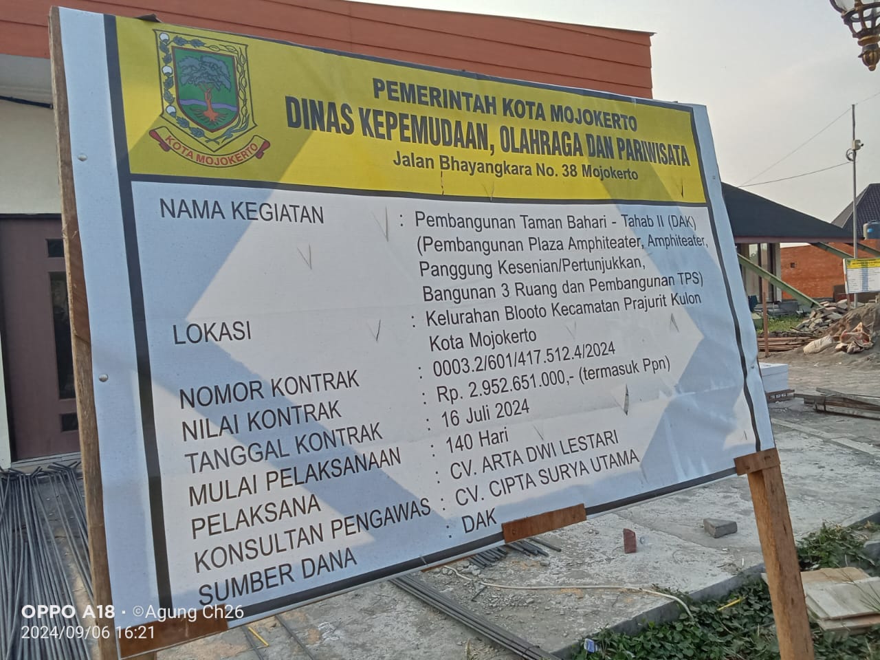 Informasi-realita.net-MOJOKERTO, – Proyek pembangunan Taman Bahari Mojopahit (TBM) tahap II yang terletak di Kelurahan Blooto, Kecamatan Prajuritkulon, Kota Mojokerto, Provinsi Jawa Timur, terindikasi dikerjakan secara ngawur dan sembrono oleh CV. Arta Dwi Lestari.