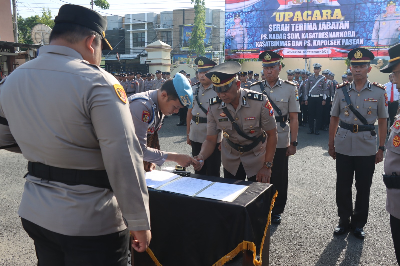 Adapun pejabat yang serah terima di antaranya, Kasat Binmas Polres Pamekasan, AKP Junaidi, S.H, dipindah tugaskan menjadi PS. Kabag SDM Polres Sampang, sedangkan Kasat Binmas Polres Pamekasan digantikan oleh AKP Saedi,S.H yang sebelumnya menjabat sebagai Kasubbag Dalpers Bag SDM Polres Pamekasan.