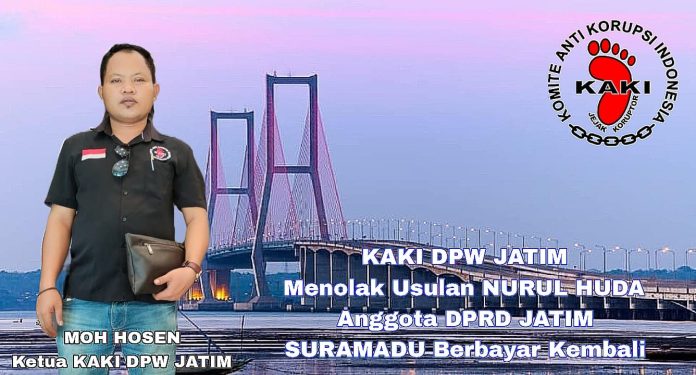 KAKI Menilai usulan Anggota DPRD Jatim Nurul Huda Atau Ra Huda Fraksi PPP kurang kerjaan hingga berinisiatif Jalan Jembatan Suramadu harus bayar kembali dengan dalih supaya anggaran bisa dibuat perbaikan atau perawatan. Seharusnya Anggota DPRD Jatim memikirkan nasib pengendara roda dua ketika melintas di area Suramadu yang kerap kali makan korban dampak jalan raya berlubang,” ujar Hosen KAKI.
