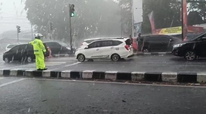 Petugas juga aktif memberikan imbauan keselamatan berkendara, terutama di tengah kondisi hujan yang membuat jalan licin.
