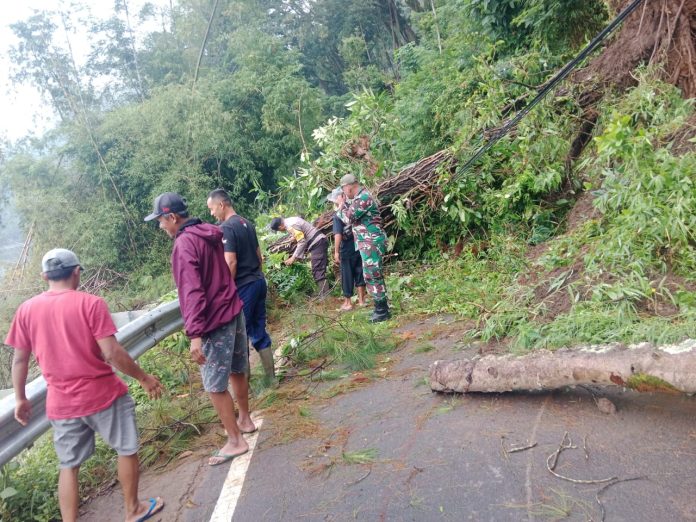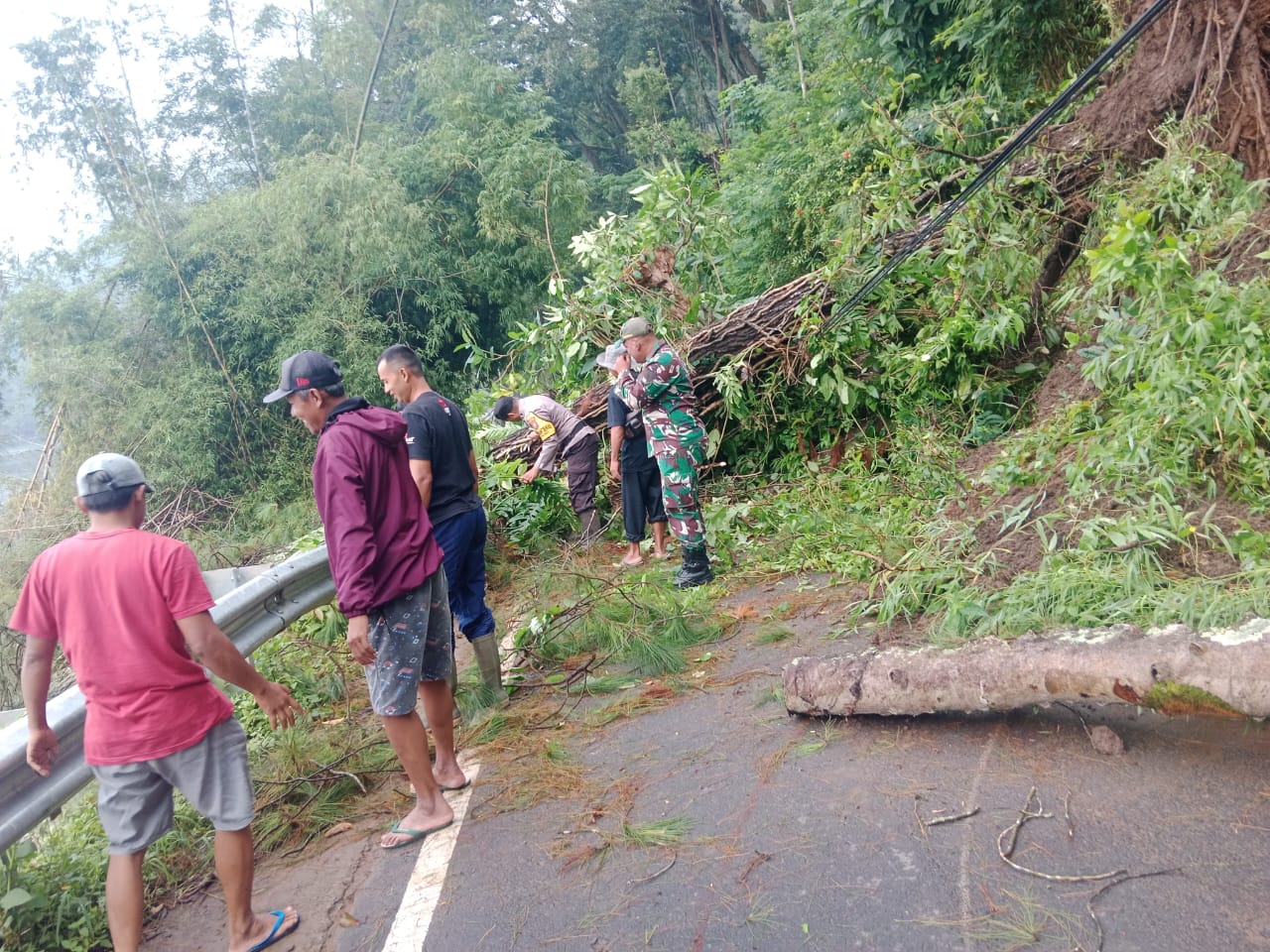 Personel Polri dan TNI bersama warga serta sejumlah instansi terkait seperti Dinas PU, Dinas Perhubungan, dan Dinas Pariwisata bergotong royong menyingkirkan material longsor dan membuka kembali akses jalan yang vital bagi masyarakat dan wisatawan.
