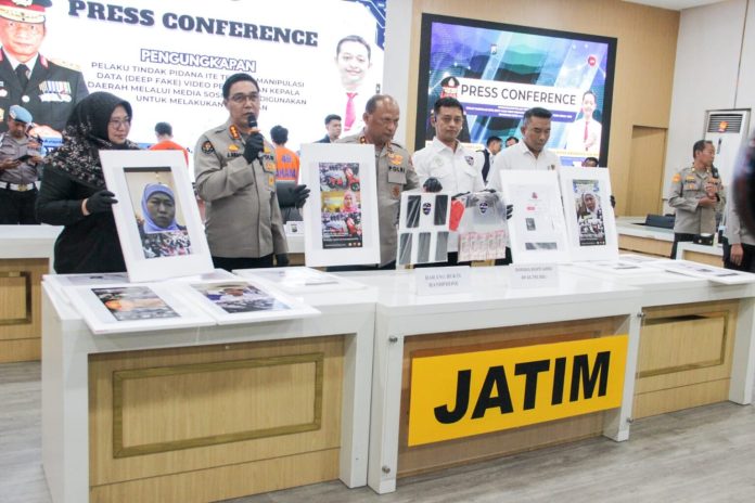 Informasi-Realita.net,Surabaya – Kepolisian Daerah Jawa Timur (Polda Jatim) berhasil mengungkap kasus tindak pidana Informasi dan Transaksi Elektronik (ITE) berupa manipulasi data dengan teknologi deepfake terhadap video pernyataan kepala daerah, yang digunakan untuk aksi penipuan melalui media sosial. Pengungkapan kasus ini disampaikan langsung oleh Kapolda Jatim, Irjen Pol Nanang Avianto, didampingi Kombes Pol R. Bagoes Wibisono dan Kabid Humas Kombes Pol Jules Abraham Abast, dalam konferensi pers di Gedung Rupatama Polda Jatim, Surabaya. (28/4/25).