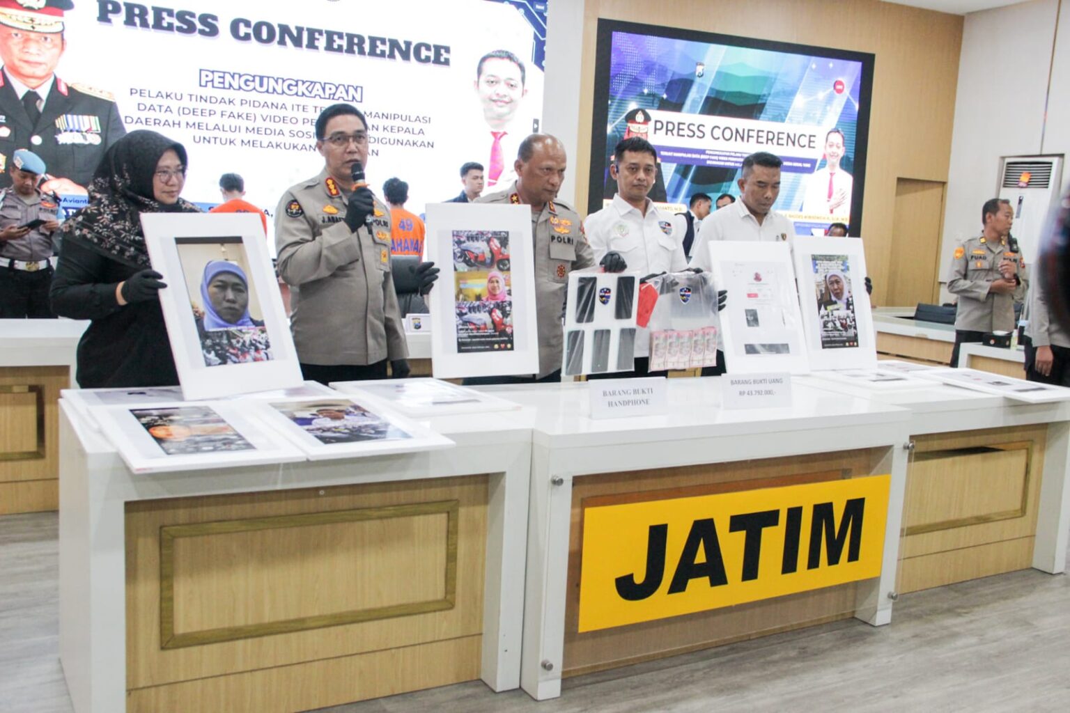 Dalam konferensi pers tersebut, Kapolda Jatim Irjen Pol Nanang Avianto menyampaikan, “Kasus ini berawal dari laporan yang kami terima pada 15 April 2025 lalu, terkait adanya penyebaran video manipulatif yang menampilkan pernyataan Gubernur Jawa Timur menggunakan teknologi deepfake. Video tersebut diunggah ke platform media sosial TikTok dan digunakan untuk menipu masyarakat dengan modus menawarkan program bantuan fiktif.”