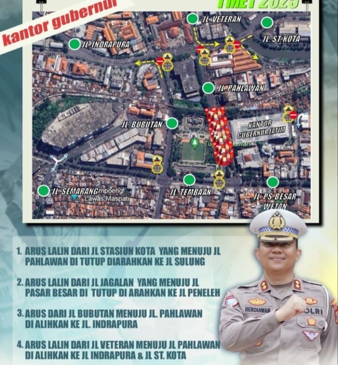 Informasi-Realita.net,Surabaya – Antisipasi kemacetan dalam aksi massa agenda hari buruh (Mayday), Kamis (1/5), Satlantas Polrestabes Surabaya akan melakukan pengalihan arus dibeberapa ruas jalan, diantaranya Jalan Pahlawan dan Jalan Gubernur Suryo, Surabaya.