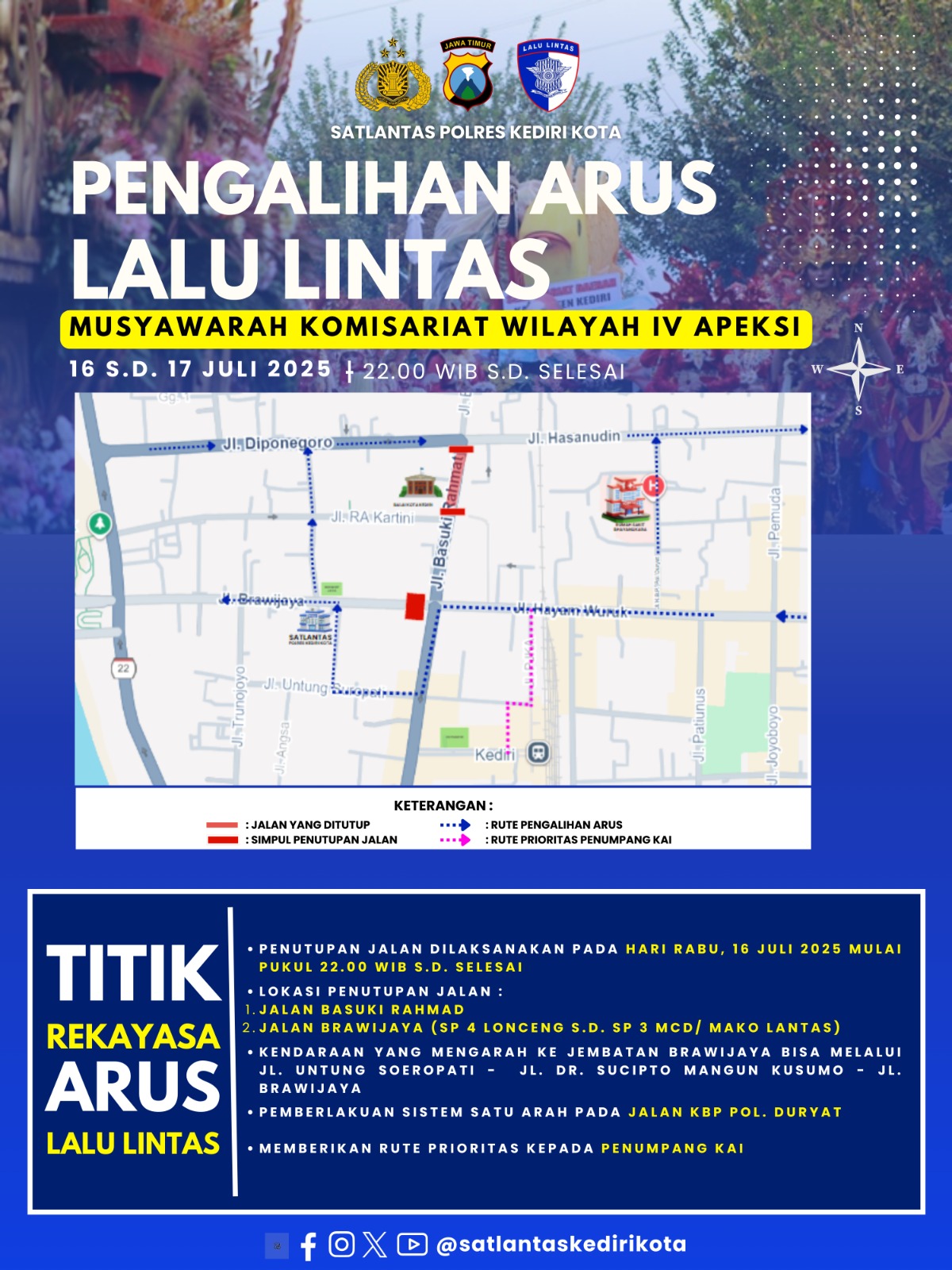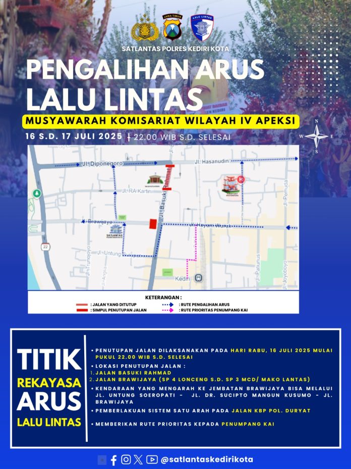 Polreskedirikota — Satuan Lalu Lintas (Satlantas) Polres Kediri Kota menerapkan sejumlah rekayasa lalu lintas dalam rangka mendukung kelancaran acara Musyawarah Komisariat Wilayah IV APEKSI, yang akan disemarakkan dengan Pawai Budaya Becak Hias pada Rabu (16/7) dan Kediri Nite Carnival 2025 pada Kamis (17/7).