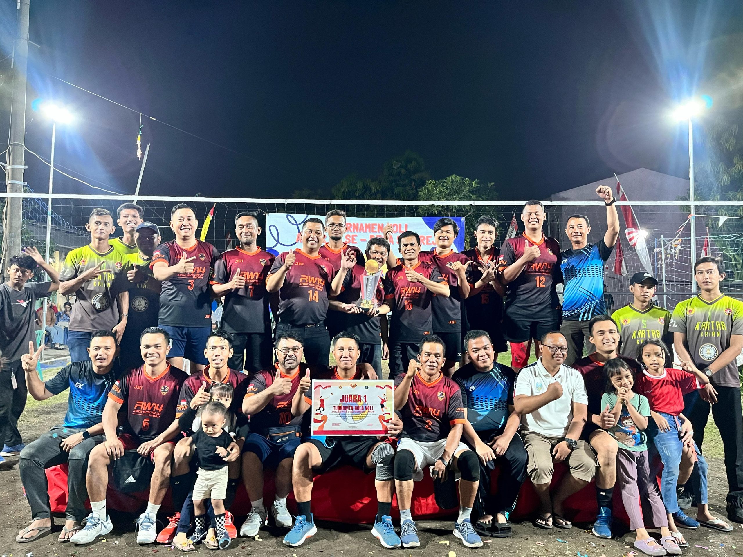 Informasi-Realita.net,Sidoarjo – Babak final turnamen bola voli Desa Sidorejo, Kecamatan Krian, Kabupaten Sidoarjo, berlangsung seru dan penuh tensi, Minggu (10/8/2025). Lomba yang diinisiasi Karang Taruna (Kartar) Abdi Bangsa itu mempertemukan tim RW 14 dari Perumahan Jade Sidorejo Indah (JSI) melawan tim RW 03 dari Kampung Sidorame.