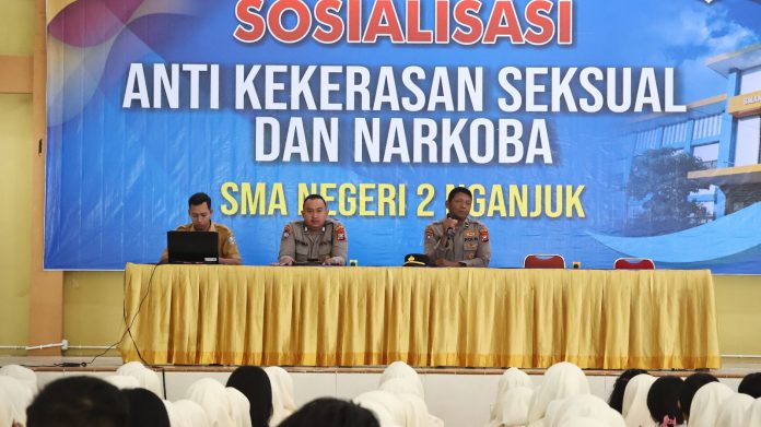 Informasi-realita.net- Nganjuk – Polres Nganjuk melalui Satuan Binmas melaksanakan kegiatan sosialisasi penanggulangan kekerasan seksual dan bahaya penyalahgunaan narkoba kepada ratusan pelajar SMA Negeri 2 Nganjuk, Selasa (7/10/2025). Kegiatan ini bertujuan memberikan pemahaman kepada generasi muda agar terhindar dari tindak kekerasan serta pengaruh negatif narkotika.