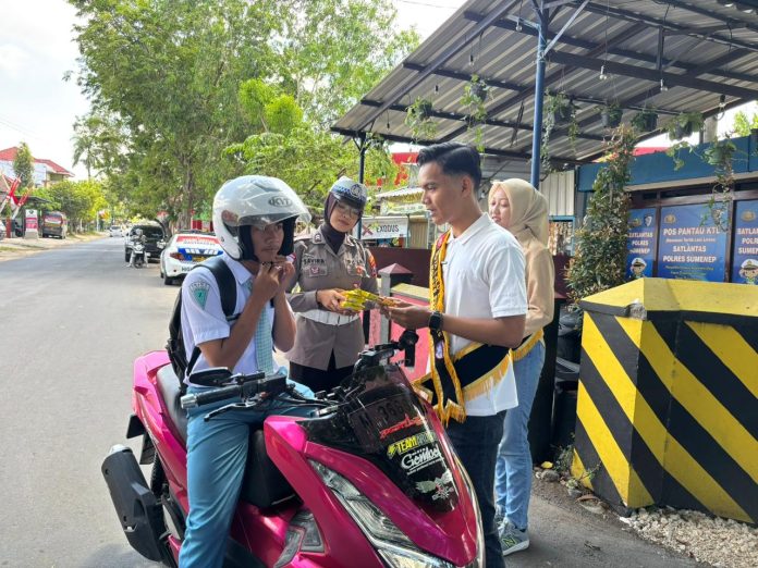 Informasi-realita.net-SUMENEP – Dalam upaya meningkatkan kesadaran masyarakat akan pentingnya tertib berlalu lintas, Satuan Lalu Lintas (Satlantas) Polres Sumenep Polda Jatim menggelar kegiatan “Polantas Menyapa bersama Duta Lalu Lintas 2025” di Pos KTL Simpang 3 Stadion Sumenep, Selasa (14/10/2025).