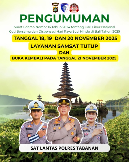 Dengan ini kami informasikan bahwa pelayanan Samsat UPTD Tabanan ditutup sementara pada tanggal 18, 19, dan 20 November 2025. Selama periode tersebut, seluruh layanan administrasi seperti pembayaran pajak kendaraan bermotor, proses balik nama, mutasi, pencetakan STNK, dan pelayanan lainnya tidak beroperasi.
