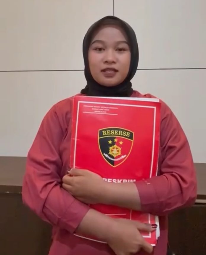 Dalam video tersebut, seorang perempuan yang mengenakan kerudung dan memegang map merah berlogo “RESERSE RESKRIM” menyatakan rasa terima kasihnya.