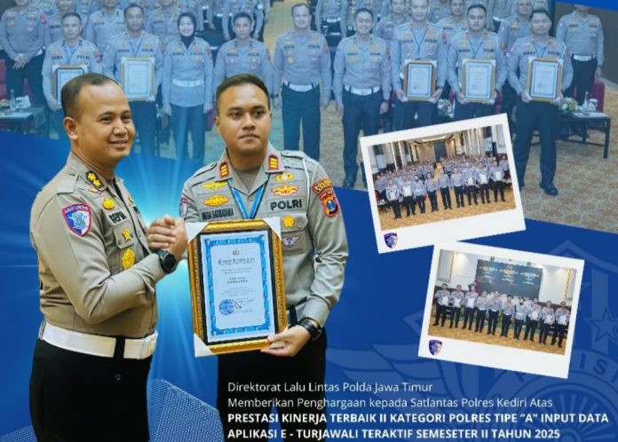 Informasi-Realita.net,Kediri – Satuan Lalu Lintas (Satlantas) Polres Kediri kembali menorehkan prestasi membanggakan. Ditlantas Polda Jawa Timur memberikan penghargaan kepada Satlantas Polres Kediri atas Prestasi Kinerja Terbaik II kategori Polres Tipe “A” dalam input data Aplikasi E-Turjawali Teraktif Semester II Tahun 2025.