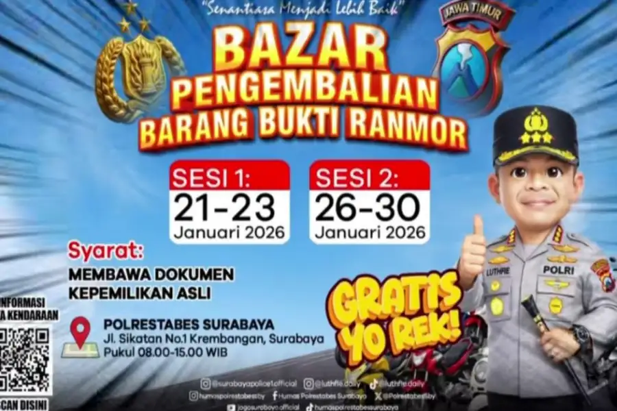 Informasi-Realita.Net,SURABAYA — Upaya humanis dan transparan kembali ditunjukkan oleh Polrestabes Surabaya melalui pelaksanaan Bazar Pengembalian Barang Bukti Kendaraan Bermotor (Ranmor) yang digelar pada 21–23 Januari dan dilanjutkan 26–30 Januari 2026.
