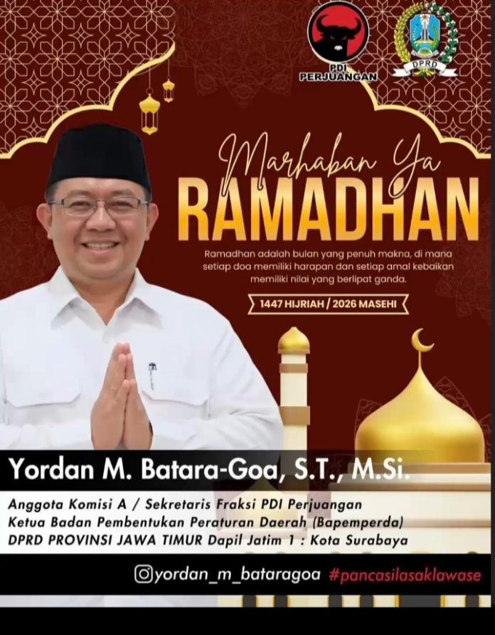Informasi-realita.net-Surabaya-Menjelang datangnya bulan suci Ramadhan 1447 Hijriah/2026 Masehi, Anggota Komisi A DPRD Provinsi Jawa Timur, Yordan M. Batara-Goa, S.T., M.Si., menyampaikan ucapan “Marhaban Ya Ramadhan” kepada seluruh umat Muslim, khususnya masyarakat Kota Surabaya dan Jawa Timur.