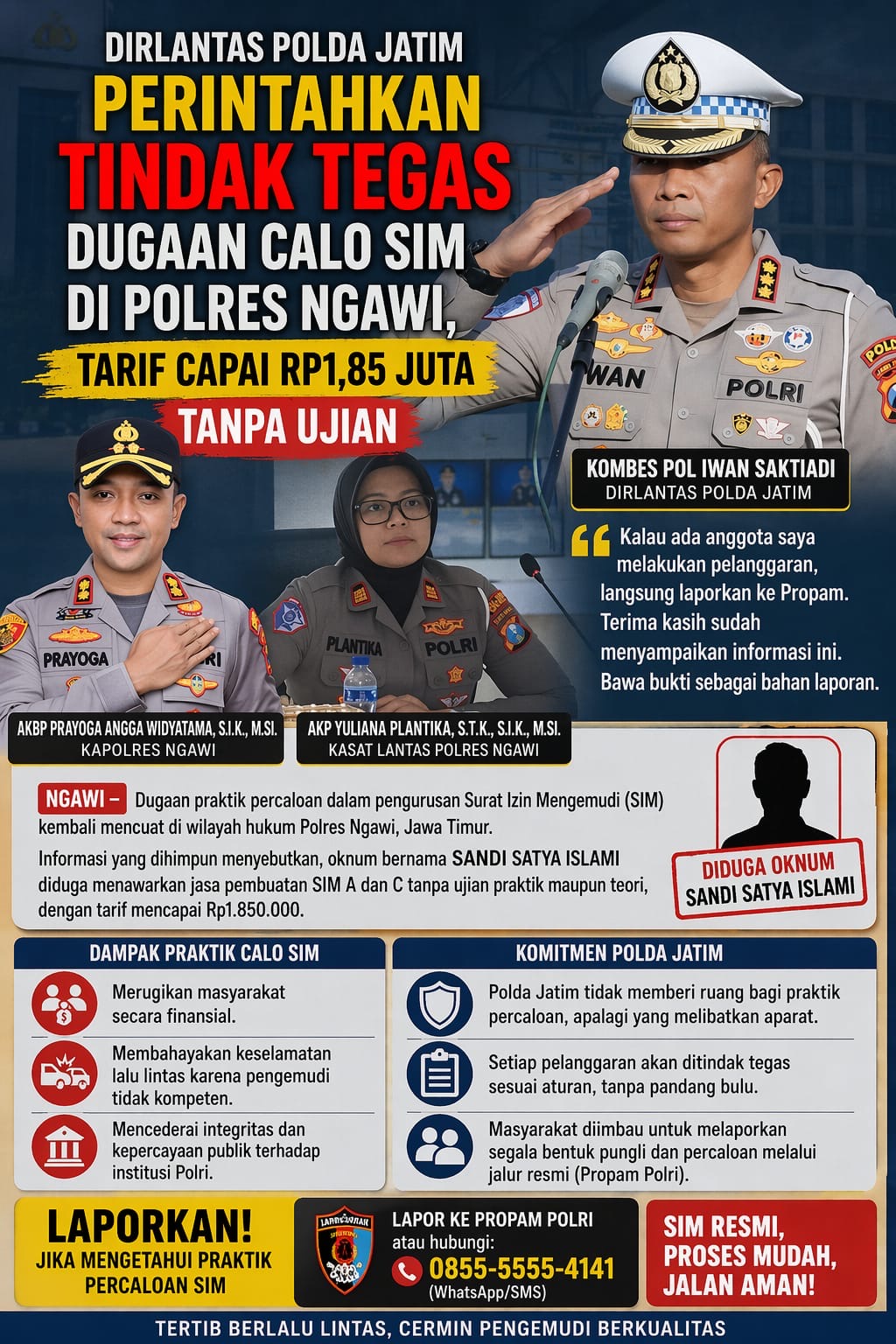 Kasat Lantas Polres Ngawi sebagai penanggung jawab teknis di bidang lalu lintas seharusnya memiliki peran strategis dalam memastikan seluruh proses pelayanan SIM berjalan sesuai aturan. Ketegasan dan komitmen dalam memberantas calo menjadi kunci utama untuk mengembalikan kepercayaan publik.