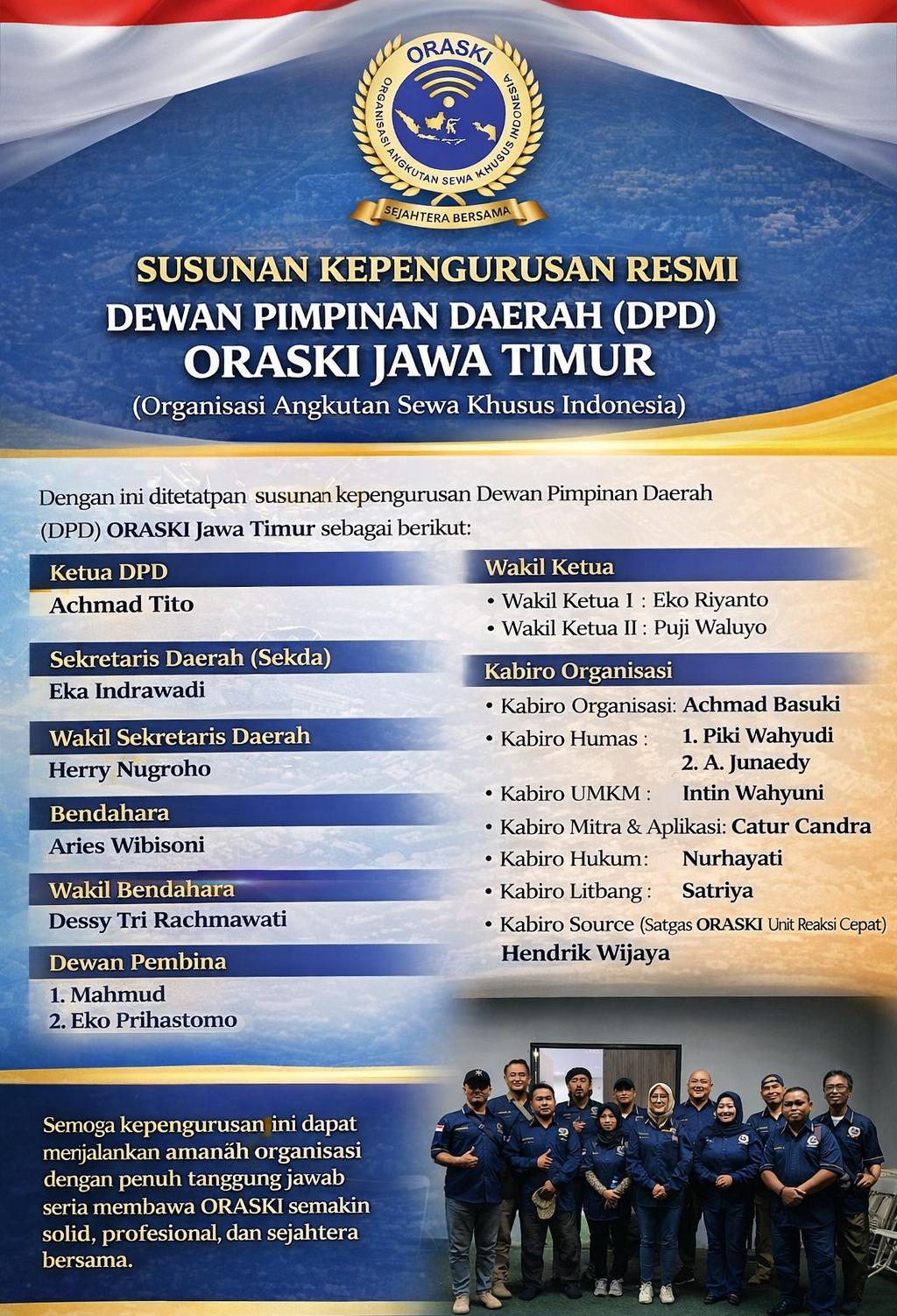 Dalam susunan tersebut, Achmad Tito dipercaya sebagai Ketua DPD ORASKI Jawa Timur, didampingi Eko Riyanto sebagai Wakil Ketua I dan Puji Waluyo sebagai Wakil Ketua II. Posisi Sekretaris Daerah diemban oleh Eka Indrawadi, dengan Herry Nugroho sebagai Wakil Sekda.
