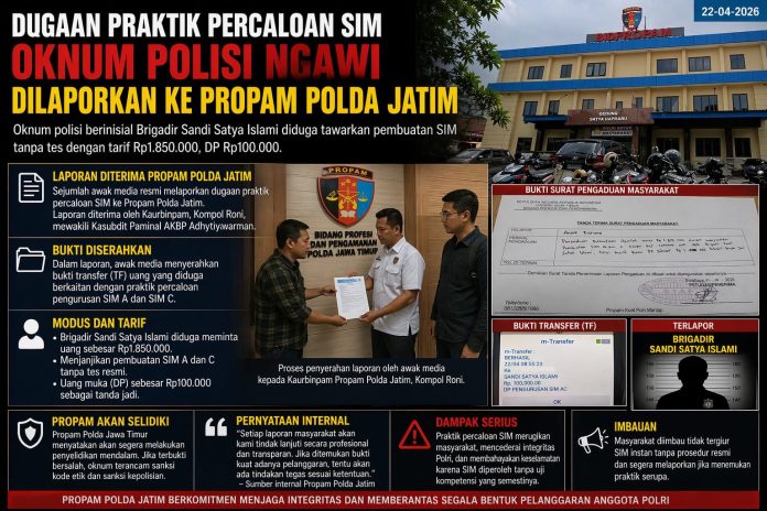 Informasi-Realita.net,Ngawi – Dugaan praktik percaloan dan pungutan liar (pungli) dalam pengurusan Surat Izin Mengemudi (SIM) kembali mencuat di wilayah hukum Polres Ngawi.