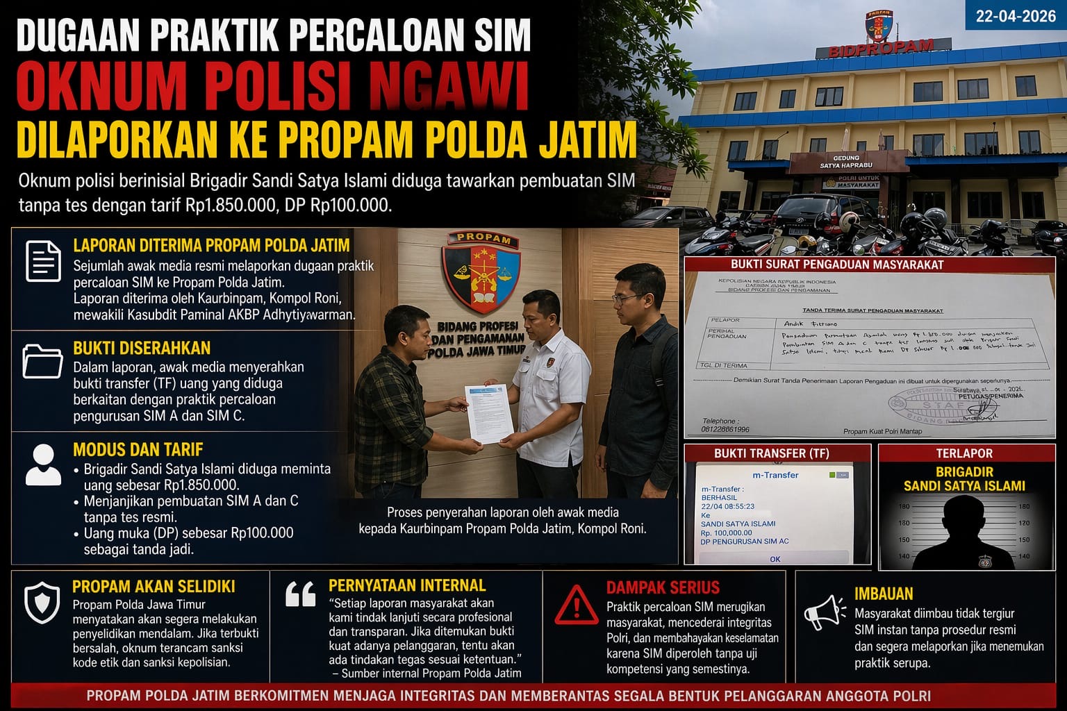 Seorang oknum anggota kepolisian berinisial Brigadir Sandi Satya Islami dilaporkan oleh sejumlah awak media ke Divisi Profesi dan Pengamanan (Propam) Polda Jawa Timur atas dugaan menawarkan jasa pembuatan SIM tanpa melalui prosedur resmi.