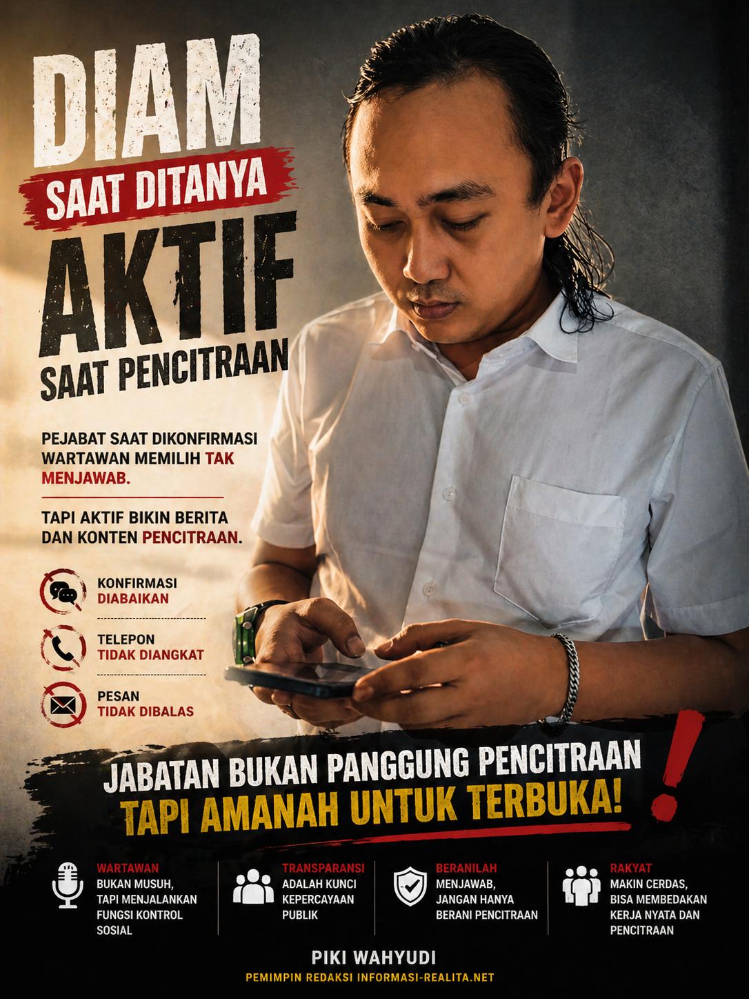 Informasi-Realita.Net,Surabaya – Di negeri yang katanya menjunjung tinggi keterbukaan informasi, masih ada pejabat yang alergi terhadap konfirmasi wartawan. Saat ditanya soal persoalan yang menyangkut kepentingan publik, mereka memilih diam. Pesan tak dibalas, telepon diabaikan, hak jawab seolah tak dianggap penting (28/4).