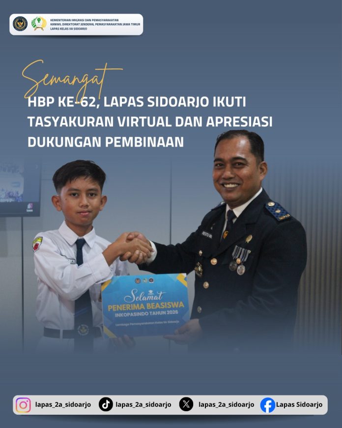 Informasi-realita.net, SIDOARJO— Dalam rangka memperingati Hari Bhakti Pemasyarakatan (HBP) ke-62, Lembaga Pemasyarakatan Kelas IIA Sidoarjo mengikuti kegiatan Tasyakuran secara virtual melalui Zoom Meeting yang diselenggarakan secara terpusat oleh Direktorat Jenderal Pemasyarakatan, Senin (27/04).