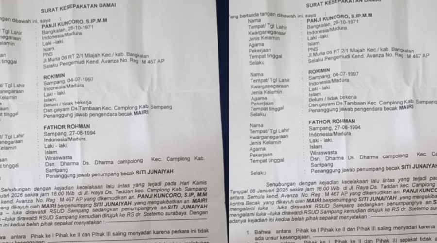 Informasi-Realita.Net, SAMPANG – Pihak kedua dalam Surat Kesepakatan Damai kasus kecelakaan lalu lintas di Kecamatan Camplong, Kabupaten Sampang, mengaku kecewa terhadap pihak pertama yang diduga belum menepati janji pembayaran santunan sebagaimana tertuang dalam dokumen perdamaian.